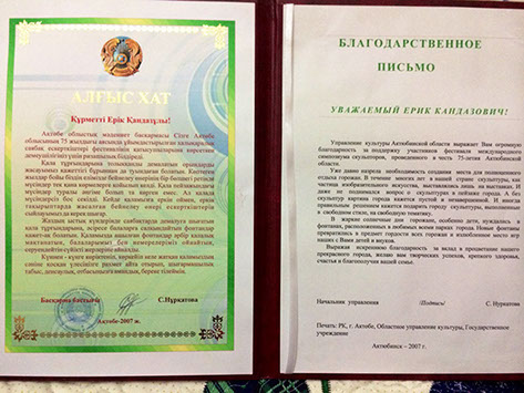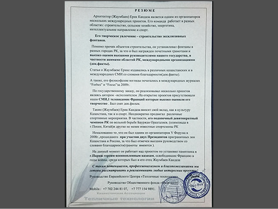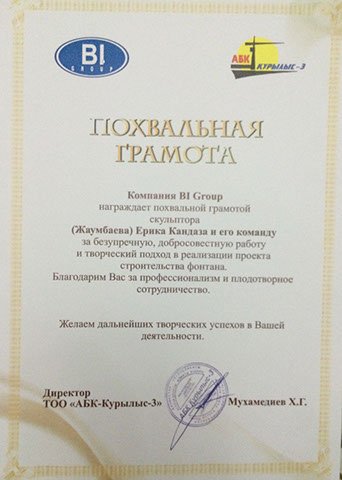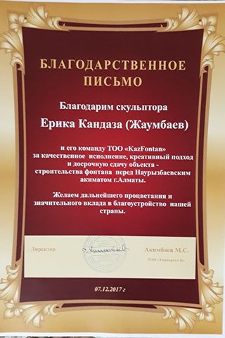 Помимо прочих объектов строительства, Он устанавливал фонтаны в разных городах РК, за что и был награжден почетными грамотами и высоко оценен высшими руководителями нашего государства, в частности акимами областей РК, международными организациями (док. факты).