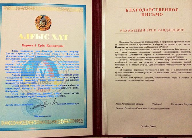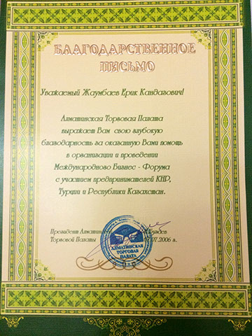 Немаловажно то, что он был одним из организаторов V форума в 2008 г., прошедшего при участии двух Президентов приграничных зон Казахстана и России, за что был отмечен высшим руководством со словами благодарности (грамоты имеются).