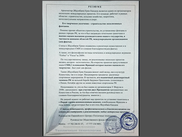 Архитектор (Жаумбаев) Ерик Кандаза является одним из организаторов нескольких международных проектов. Его команда работает в разных областях: строительство, сельское хозяйство, энергетика, интеллектуальное направление и спорт.